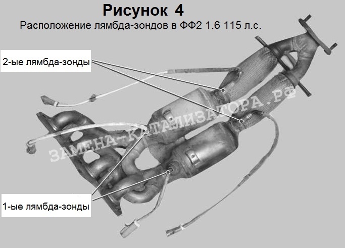 Обманка ставится под второй лямбда-зонд. В случае ФФ2 1.6 115 л.с. их два (смотрите рисунок 4), у машин с двигателем 1.6 (100 л.с.), 1.8 и 2.0 один катализатор после которого расположен кислородный датчик. Соответственно обманка в таком случае нужна одна.